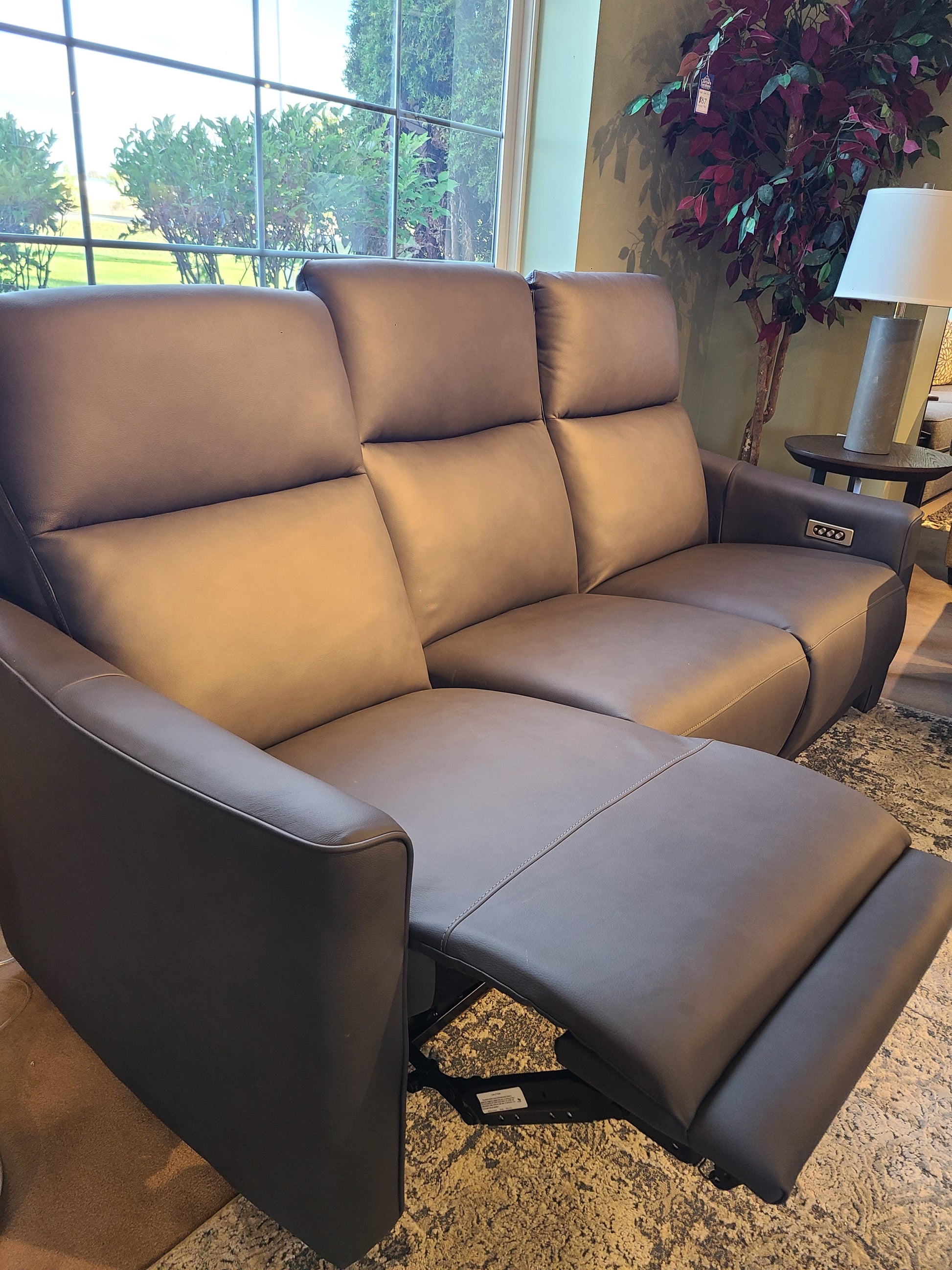 Shown in Grade 200 Leather/Leather Match with POWER reclining, adjustable headrest, and lumbar on both ends of the sofa. Center seat is stationary (non-moving). Also included is the moveable cupholder!