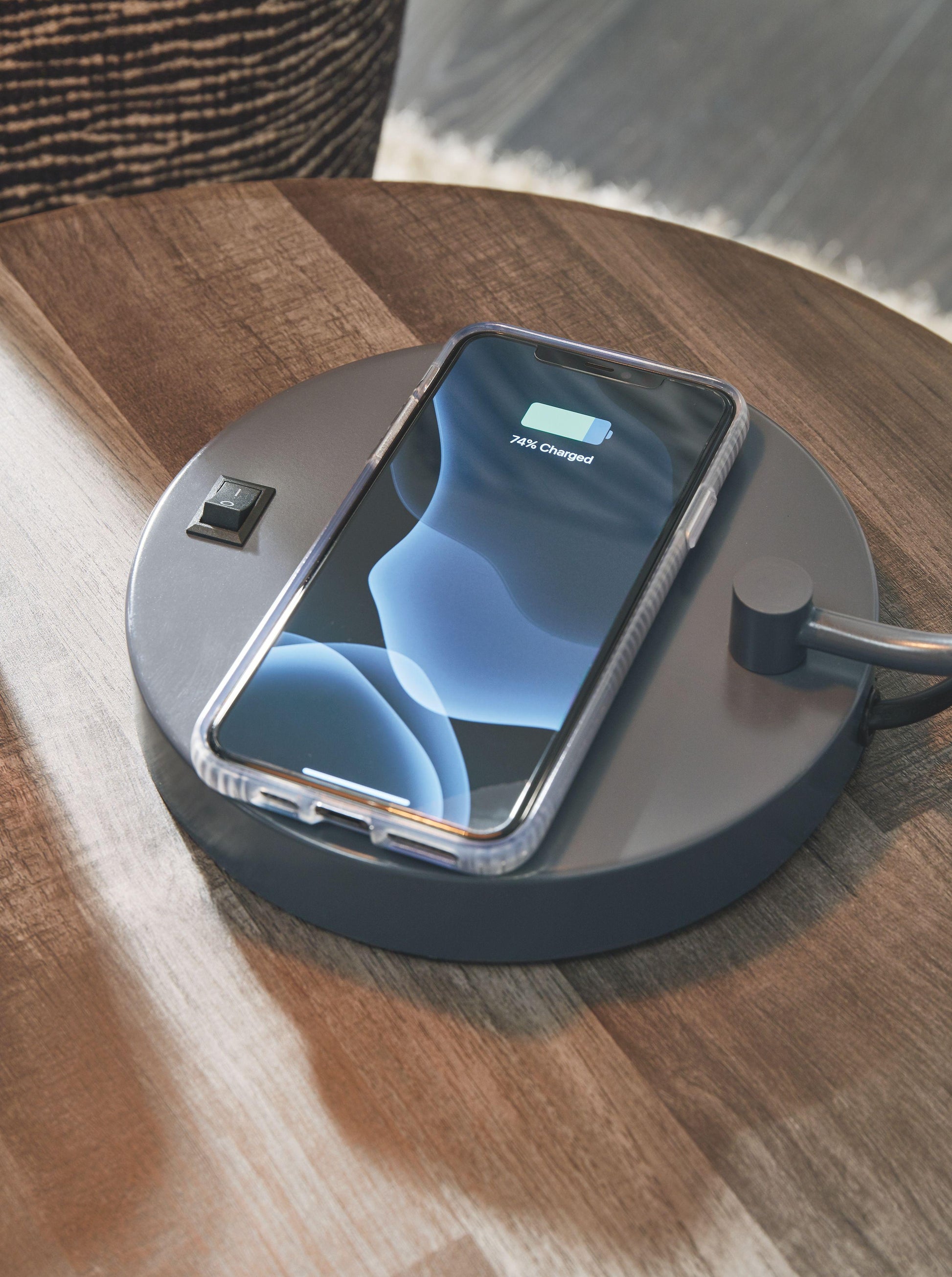 A beautiful accent to your desk, this lamp with its adjustable dome shade casts cool shadows as it suspends from a dramatic stem. Featuring a wireless charging pad and 1 USB charging port, you can charge up without cords or clutter. Turn on your decor with this on-trend accent lamp in any space, and give a nod to contemporary style with the flip of a switch.