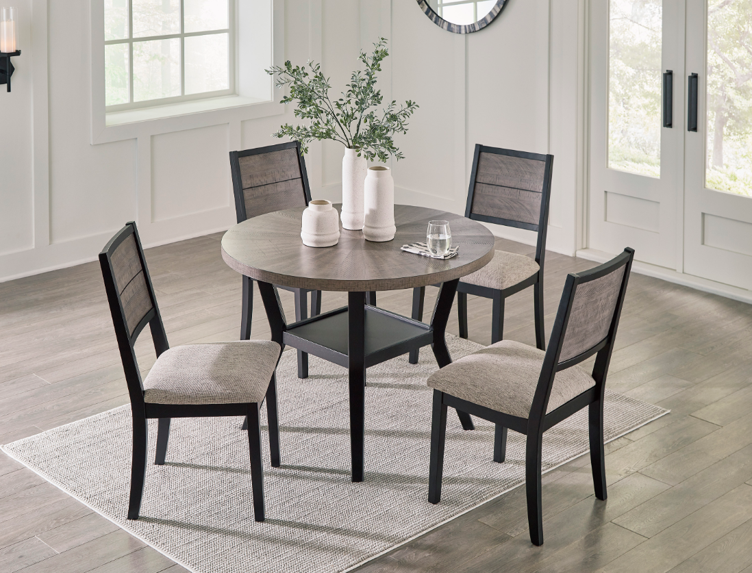 Refresh your dining area with this five-piece table set. Its two-tone finish pairs a distressed weathered gray wood tone with a matte black frame. The chairs have stylish bent plank backs and comfy upholstered seats for an on-trend look you’ll love. This stunning dining furniture is ready to impress your guests and create unforgettable memories.
