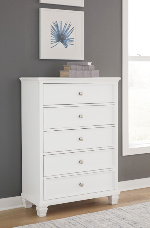 Exuding a timeless casual design, this chest of drawers is ready to define your personal space. It easily adapts to a variety of interiors, combining a clean, contemporary white finish with framed drawer fronts and round metal knobs. Featuring five storage drawers with dovetail construction and traditional tapered feet, this piece is sure to bring elegant simplicity to your bedroom.