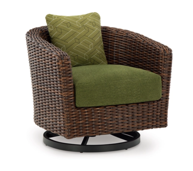 This outdoor swivel lounge chair recalls the aesthetics of nature to bring an inviting, high-style feel to your patio or lanai. Its Nuvella+™ performance fabric is made with enhanced UV resistance, so the chic green hue stays brighter for longer. Worried about the weather? Don't sweat it—the durable resin wicker withstands the elements from season to season.
