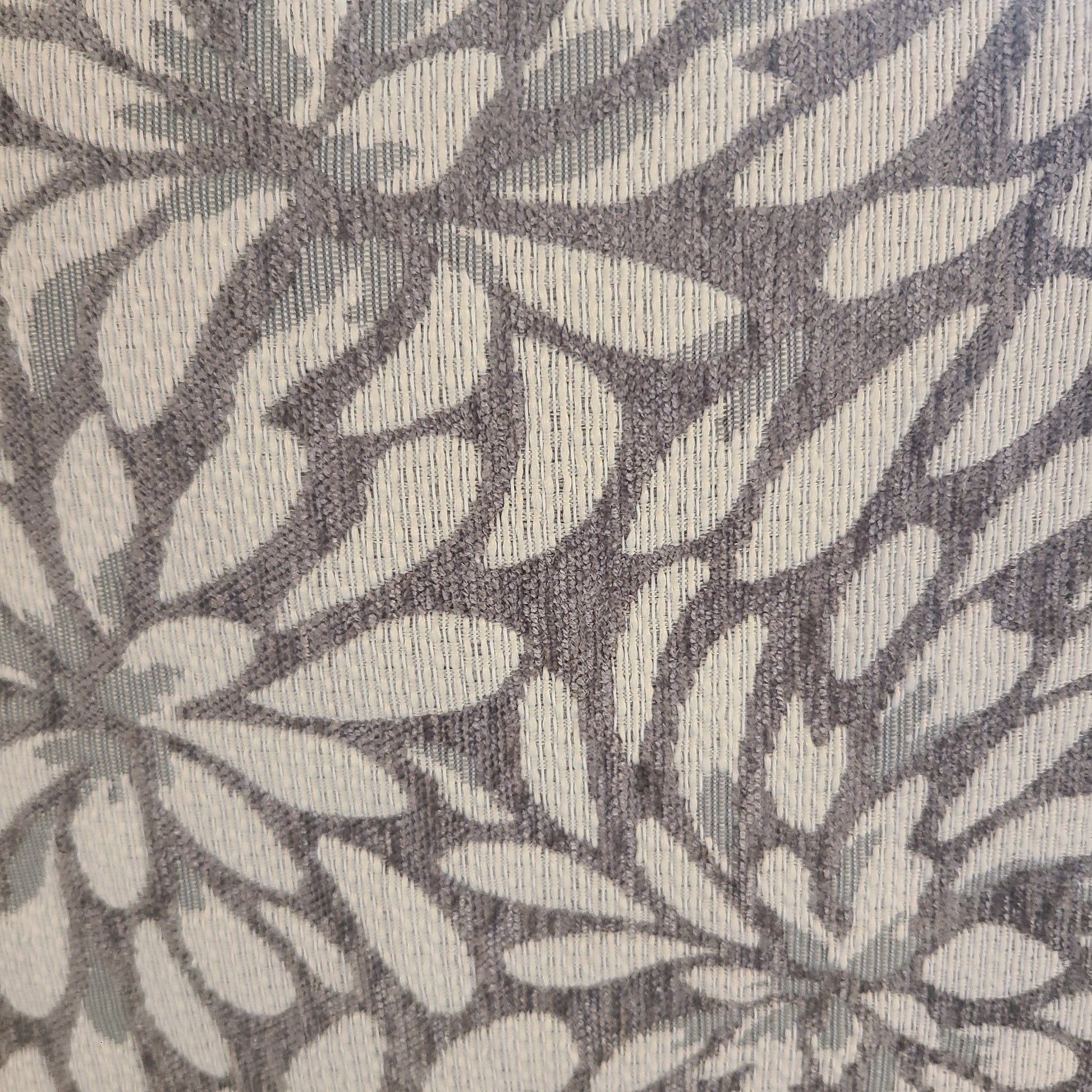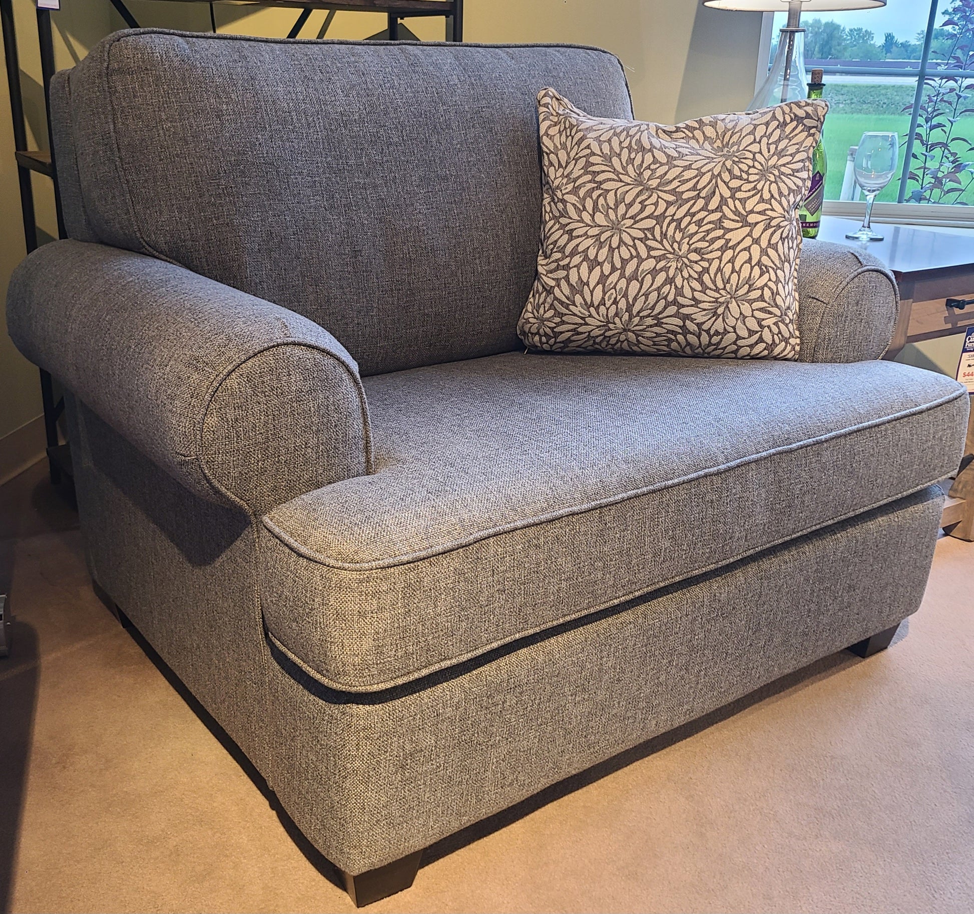 Shown in a Pier Grey upholstery accented with a grey and cream petal patterned pillow.