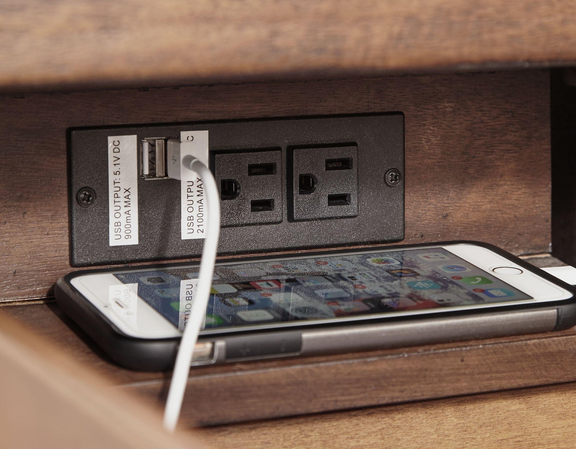 Earthy, rustic character. Clean, contemporary lines. The best of both stack up beautifully in this chairside end table. A simple, blocky profile is enriched with a two-tone finish with deep distressing for a decidedly different aesthetic. And with subtly placed power outlets/USB charging stations, it’s high design meets high tech.