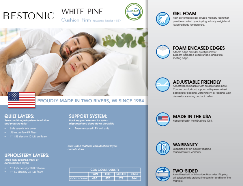 Experience ultimate comfort and support with the White Pine Firm Mattress. Made in Two Rivers Wisconsin, this two-sided mattress features Certipur Foams for healthy sleep. With a 14.5" profile and wire-tied coils, it offers maximum support, while the foam encasing provides superior edge support. Sleep better with this high-quality, durable mattress.